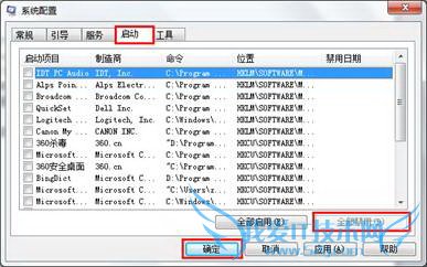 5、单击“启动”标签卡,然后点击“全部禁用”并确定,如下图:
