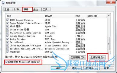 4、单击“服务”选项卡,单击以选择“隐藏所有 Microsoft 服务”复选框,然后单击“全部禁用”,如下图: