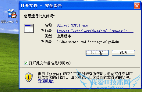 安装QQlive:双击下载的QQlive软件即可启动安装进程,如果出现“安全警告”窗口(如下图所示),请单击“运行”选项(因为本软件是可信任的),然后根据安装界面的提示一步一步完成安装过程。