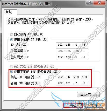如果我们发现在自动获得状态下提示DNS错误,那么我们就要自己手动给系统设置正确的DNS地址。选择 “使用下面的 DNS 服务器地址”,然后填入你得到的地址就可以了,一般我们填写两个,一个首选 DNS 服务器地址,一个备用 DNS 服务器地址(这个不填也可以)。