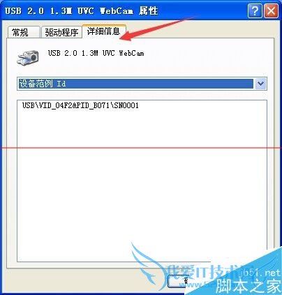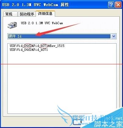 4、在设备范例那里点下拉框-选择硬件ID,下方会出现值,如:USBVID_04f2&PID_b071&REV_1515,如图所示,记住2个画圈的数据