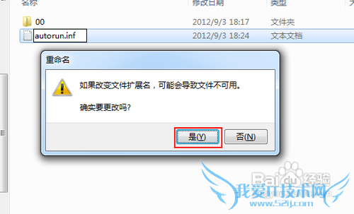 依然选择资源管理器中的“工具”、“文件夹选项”,切换到“查看”选项卡,取消勾选“隐藏已知文件类型的扩展名”,U盘内就会出现“autorun.txt”的完整名称,将“txt”改为“inf”,在弹出的对话框中选择“是”。