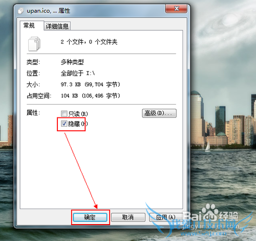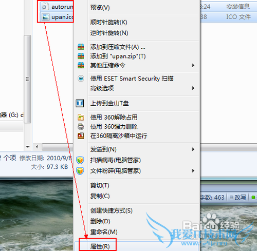 将下载的ico格式的图标文件放在U盘根目录,并命名为“upan.ico”,选择“upan.ico”和“autorun.inf”文件,右击选择“属性”,在弹出的对话框中勾选“隐藏”。如果第2步中不设置“显示隐藏文件”的话,此时这两个文件将被隐藏。