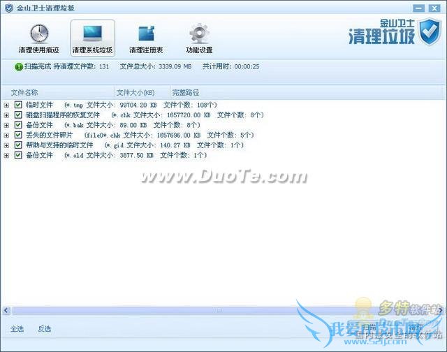 按照下面的选项扫描,检查到垃圾文件131个,3339.09MB。能检测出一些软件产生的备份文件,因此扫描到的待清理文件较大,可以根据需要考虑是否删除。