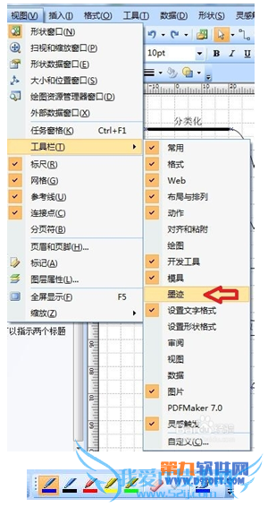 6、选择“视图”-》“工具栏”;可依次调出需要的工具栏;如调出墨迹工具栏;