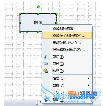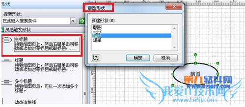 2、将 左侧“形状”窗口内 “灵感触发形状” 拖拉到绘图区;双击 重写入主题文字为 “脑图”;右击主标题,选择 “更改标题形状...”,更改为矩形;