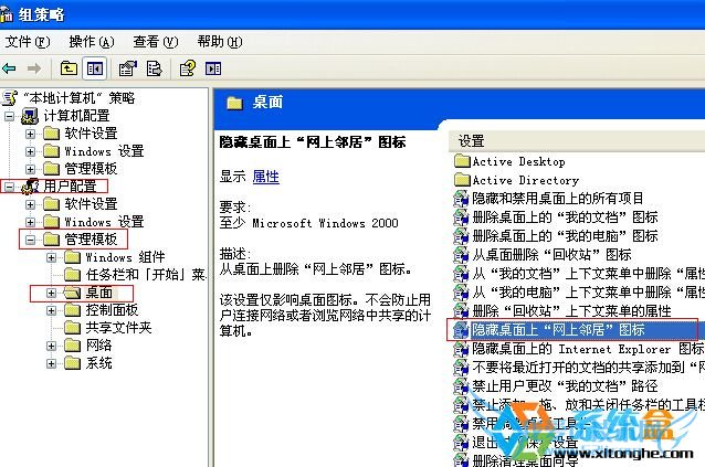 2、在弹出的本地组策略编辑器中依次展开“用户配置”、“管理模板”、“桌面”选项,在右侧的桌面设置窗口下找到并双击打开“隐藏桌面上“网上邻居”图标”选项;
