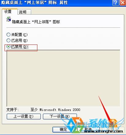 3、双击“隐藏桌面上“网上邻居”图标”选项,将状态设置为“已禁用”。