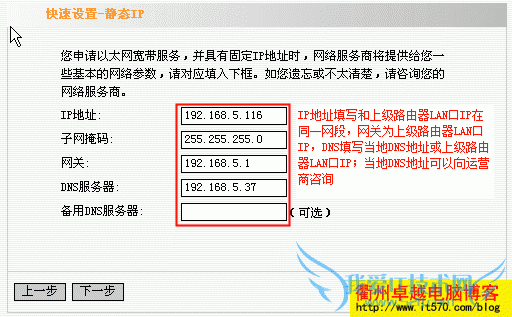 选择静态上网方式后,点击“下一步”,IP地址设置要和上级路由器LAN口IP在同一网段,网关为上级路由器LAN口IP,DNS地址为上级路由器LAN口IP或填写当地DNS服务器地址(当地DNS服务器地址可以向运营商咨询),设置完成后点击“下一步”如图所示: