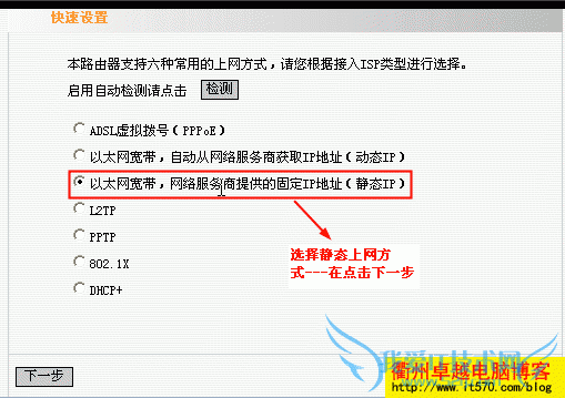 登陆路由器管理界面,点击“快速设置”----“以太网宽带,网络服务商提供的固定IP地址(静态IP)”。如图所示:
