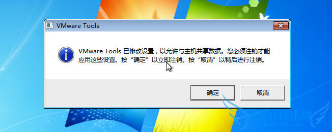 5、接下来我们启动虚拟机,进入系统以后 Vmware Tools 工具提示我们检测到有与主机的共享文件夹,需要注销才能使用,点击“确定”按钮继续。