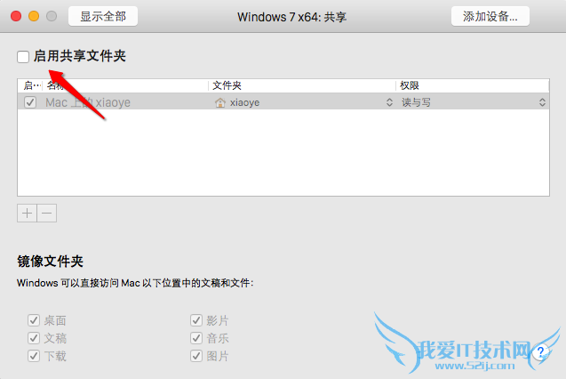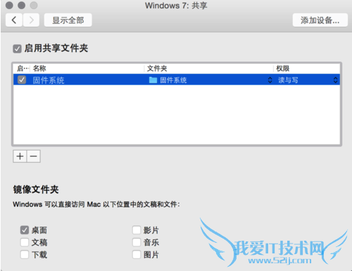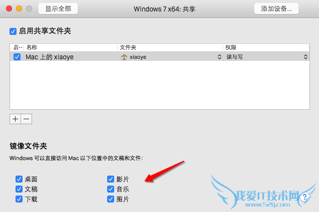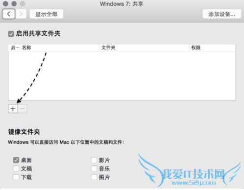 7、如果你想要共享多个文件夹的话,可以在虚拟机的共享设置窗口中添加即可。虚拟机默认为我们提供 Mac 上的桌面、文稿、音乐、图片等共享选项,如果你要想添加其它文件夹的话,请点击“+”按钮,如图所示