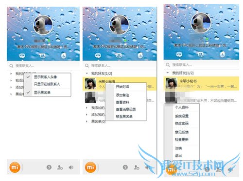 在用户头像之下主要就是联系人窗口了,主要分为联系人、米聊群以及最近联系人三栏,在联系人中默认分为四组:我的好友、我添加的人、添加我的人以及黑名单。不过由于目前PC米聊还处于内测阶段,你无法对好友列表进行分组、重命名以及删除等操作,希望正式上线之后会开放。右键点击分组或者空白处,弹出的菜单仅包括一些简单的选项:显示联系人头像、只显示在线联系人、显示黑名单。右键点击联系人头像可以进行聊天、修改备注、查看资料、查看聊天记录以及拉黑等操作,当然和其它聊天工具一样,双击好友头像也可以直接开始聊天,当鼠标悬停在联系人头像上的时候可以查看该好友的名片以及聊天记录。如果好友太多的话,你也可以直接在联系人窗口中使用联系人搜索功能直接搜索,直达相关联系人。