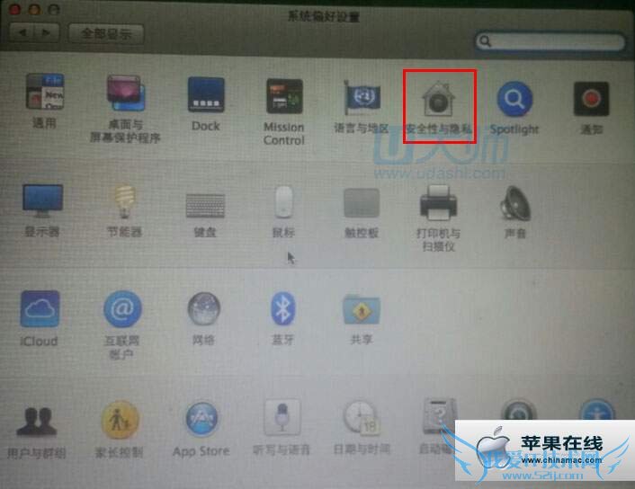 2、出现“系统偏好设置”界面后,点击“安全性与隐私”: