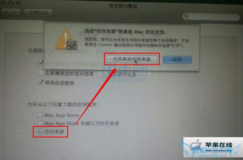 4、解锁后,点击“任何来源”,这是会弹出选取“任何来源”将减弱mac的安全性,这里直接点击允许来自任何来源: