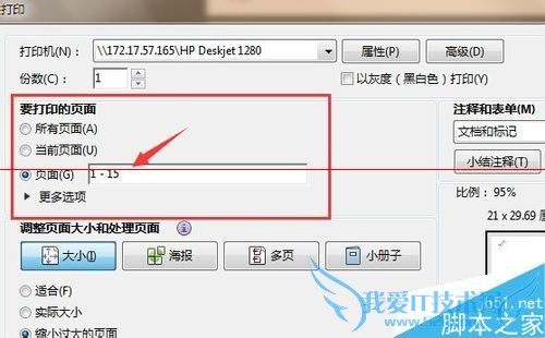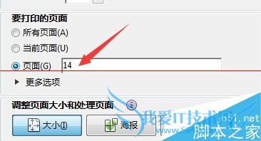 6、弹出打印对话框。找到图中所示的“要打印的页面”显示,选择第三项——页面。把默认的页数【1-15】删掉,输入我们要打印的页面【14】