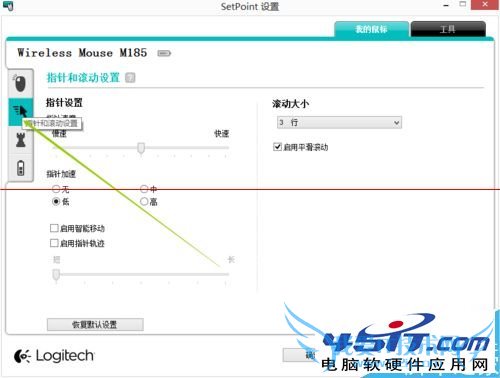 2、点到指针和滑轮设置,如图所示,调节指针速度以及指针加速,也可以启用智能移动以及指针轨迹,右侧是滚动的行选择,有三行和一行可以选择。