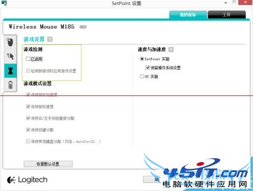 3、如果您是游戏玩家,想用这个无线鼠标玩游戏,可以进行游戏方面的设置,先启用最上方的启用游戏检测,当进入游戏时,会自动启用游戏设置,如图所示。下方的游戏模式设置都是默认。