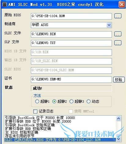3、提示执行成功,至此,制作带SLIC2.1 的BIOS的步骤就成功了,接下来就是使用BIOS刷新工具将制作的新BIOS文件刷入计算机系统BIOS中了,这个方法比较简单,就不说了。