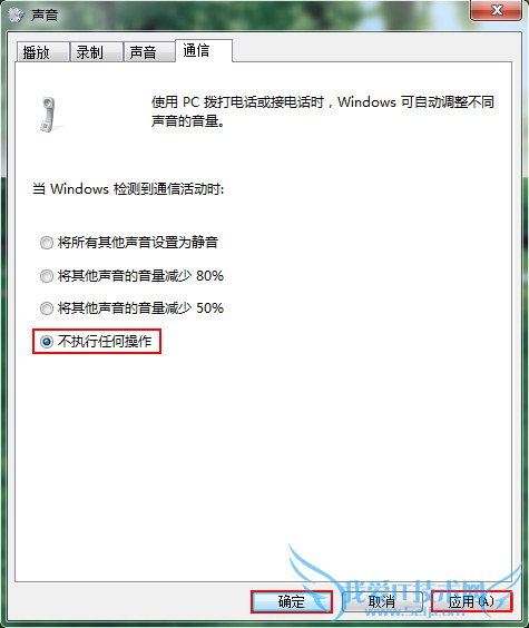 3、将选项更改成“不执行任何操作”,然后点击“应用——确定”按钮,如下图所示: