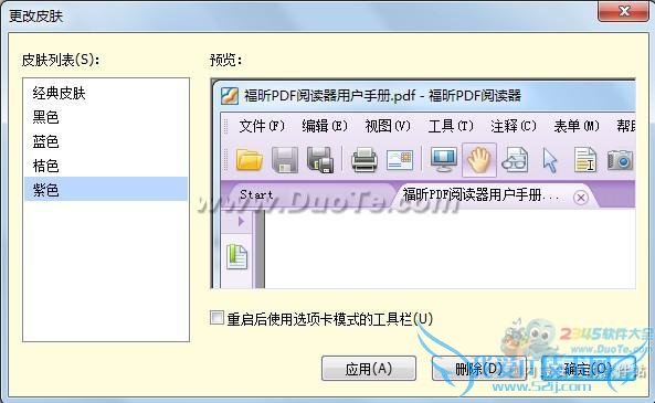 福昕PDF阅读器为用户提供了经典皮肤、黑色、蓝色、桔色、紫色等5种皮肤颜色,用户可根据自己的喜好或者文档内容选择适合的皮肤,小编偏好比较温和的桔色,阅读起来不刺激眼睛。