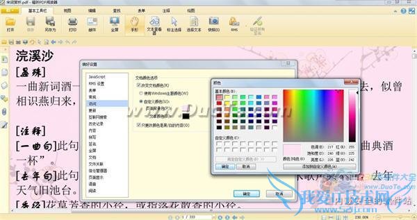 选择编辑→背景→添加(更新),用户可以添加纯色或图片背景,此外还可以选择工具栏→偏好设置→访问→改变文档颜色→自定义颜色,用户可根据需要选择修改页面背景色和文本颜色。小编选择了修改页面背景色,文本颜色还是保留黑色,修改后整个界面感觉比较温和舒服,也符合本人的习惯,此外感觉还颇符合内容的意境的,呵呵