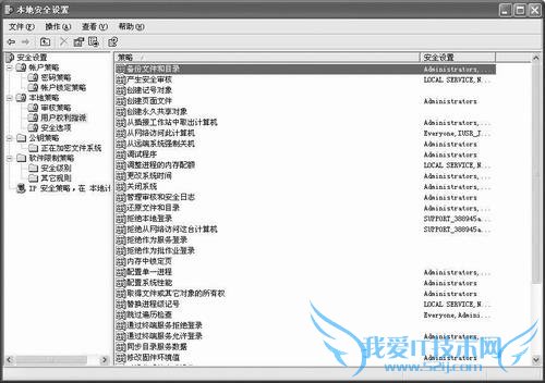 如果你是系统管理员身份,可以指派特定权利给组账户或单个用户账户。在“安全设置”中,定位于“本地策略→用户权利指派”,而后在其右侧的设置视图中,可针对其下的各项策略分别进行安全设置(图2)。