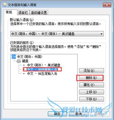 2.在“已安装的服务”中选择有问题的输入法,然后单击“删除”(删除并不是从硬盘上删掉,而是暂时从输入法中删除),然后单击“应用”按钮。