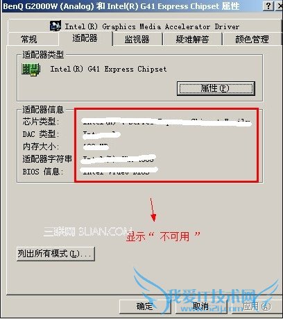 (2)如果(1)中方法操作后,重启电脑进系统,只是颜色正常了,但是分辨率不正常,并且不能调,查看系统是否有显卡驱动,在桌面上 右击,属性,设置,高级,适配器下看状态: