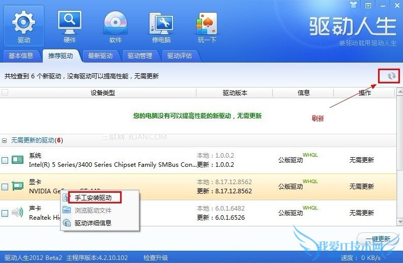 下面教大家怎么更新显卡驱动,小编推荐使用“驱动人生”这款软件,使用方便,支持的驱动种类也很齐全。打开驱动人生2012,点驱动,推荐驱动,点下刷新,找到显卡设备,右击选手动安装,安装完后按提示重启。