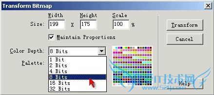 1. 素材准备:一幅或多幅任意8-bits位图,大小不限。将素材导如director演员表中。对于大于8-bits的位图,选择菜单ModifyTransfrom bitmap.. ,调出对话框设置如下: