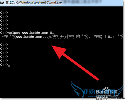 2、像上面这样子测试百度服务器的80端口,这个可以看到是有反应的,是开放通的。如果没有开放就像下面这样的显示。