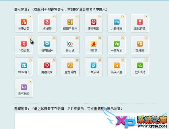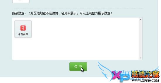 点击不想展示的新浪微博勋章右上角的小叉叉,此时,被删除的勋章就会出现在隐藏勋章列表中,如图所示,点击“保存”按钮即可,在弹出的保存成功提示框中点击“确定”按钮。