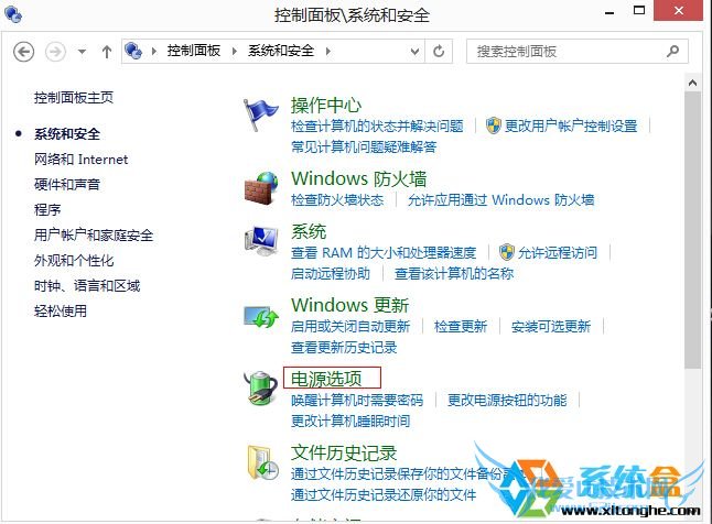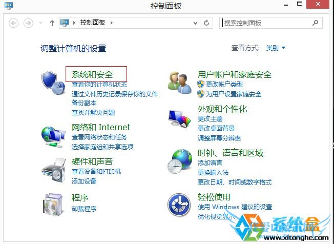 2、然后在控制面板里选择,“系统和安全”(本文由 www.xitonghe.com 整理)选项;