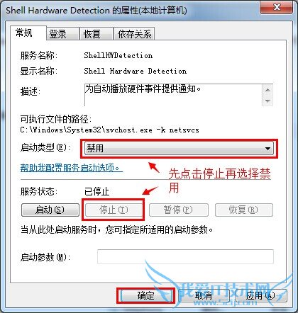 3.在打开的Shell Hardware Detection属性对话框中,先点击服务状态右侧的按钮“停止”,使该服务状态为“已停止”,再把启动类型设置为“禁用”,然后再点击确定完成设置。如下图所示