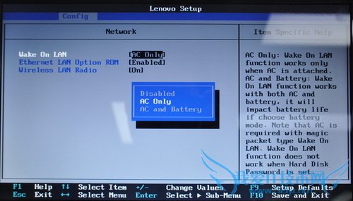 三个选项功能分别是“网络唤醒功能”“网络引导功能”“无线网卡功能”。“wake On Lan”中的“AC Only”即只连接电源情况下启用。“Wireless Lan Radio”设置为“ON”即启用无线网卡。