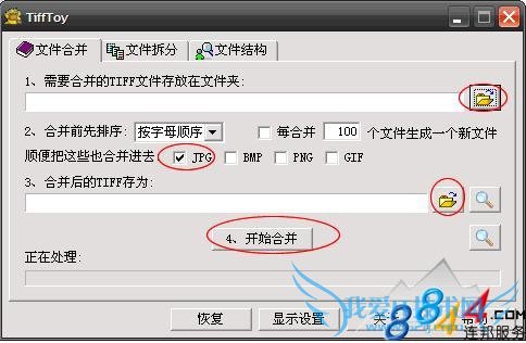 1.图片文件合并:支持的图片格式有TIF、JPG、BMP、PNG、GIF。在合并转换后,输出的是tiff格式的图片文件。可以指定每个文件包含的散页数,如用于Office2003的OCR识别时最好每个文件不超过100页。