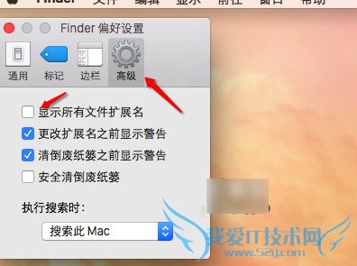 第二步、在 Finder 偏好设置对话框,在高级选项界面,点击勾选“显示所有文件扩展名”后,关闭设置界面,打开 Finder 就可以看到文件扩展名了!