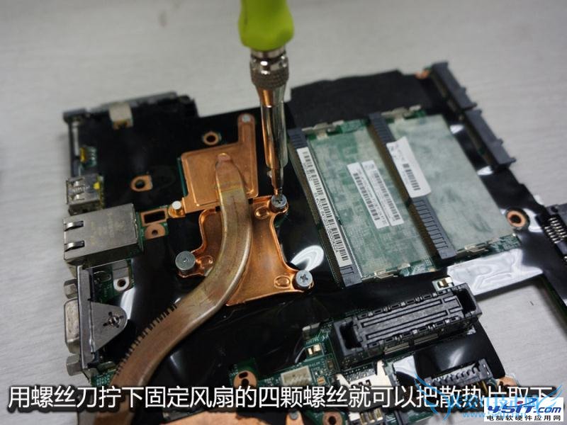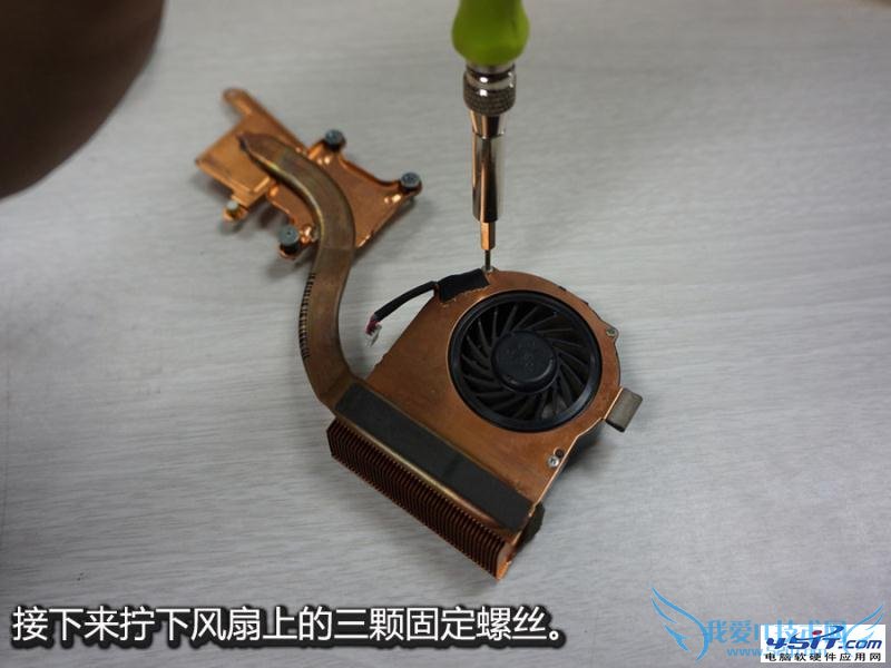 要更换风扇,我们要继续把散热片上的三颗固定螺丝拧下来。