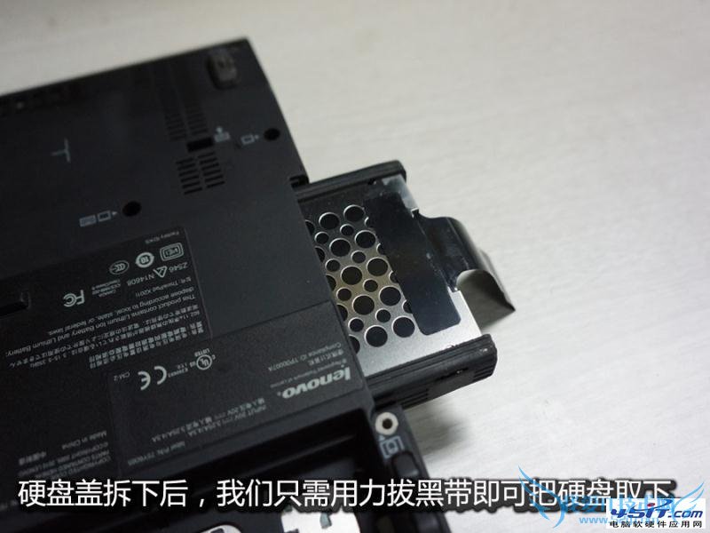 硬盘盖拆下来之后,只需用力的拔出黑带即可把硬盘取下。