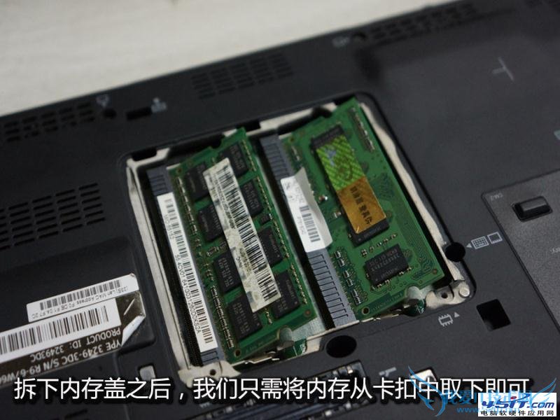 拆下内存盖后,我们只要把两边的卡扣松动,轻轻一拔即可把内存取下。