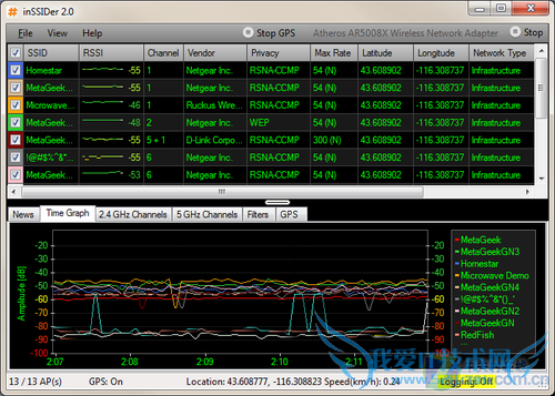 对于inSSIDer所搜索到的每一个WiFi网络,你能够获得每一个路由器的MAC地址、设备制造商(大多数能识别)、设备广播的SSID、使用频道、安全是否到位、无线连接速度等详细信息。已经当前网络强度并且及时更新信号强度信息。
