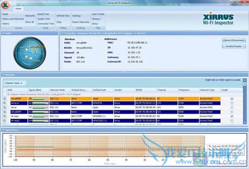 Xirrus主界面提供一个类似雷达一样的显示窗口,对于搜索到的无线信号,能够给出其位置提示。并且在其旁边将列出用户指定WiFi网络的详细信息,包括信号强度、网络类型(11b/g/n)、路由厂商、传输频道以及各类地址信息等。
