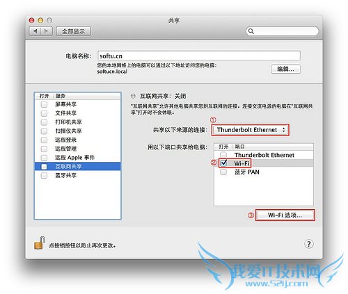 2,将“共享以下来源的连接”设置为你当前的上网方式(比如当前是PPPoE就选PPPoE,当前是以太网就选以太网,当前是Thunderbolt Ethernet就选Thunderbolt Ethernet),在“用以下端口共享给电脑”中选中“Wi-Fi”,这里的意思就是将上面的上网方式用下面的共享方式共享出去,一个是选来源,一个是选出口。如果你要设置Wi-Fi密码,请点击下方的“Wi-Fi选项”,可以设置网络名称、频段、安全性,网络名称默认就是你的电脑名称,频段保持默认即可,安全性就是密码,你可以选择“WPA2个人级”,然后输入密码,确认即可。