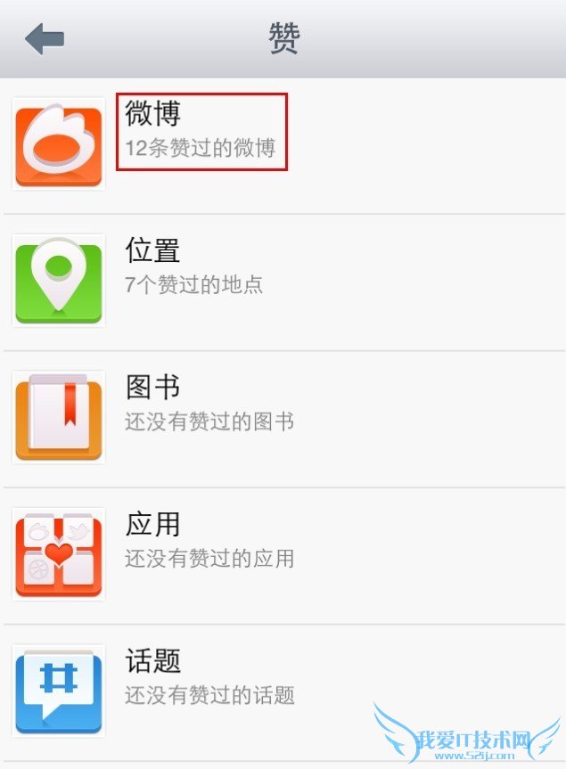 点击“赞”的按钮,进入赞的页面,可以看到所有赞过的内容,包括微博、位置、应用、音乐等;