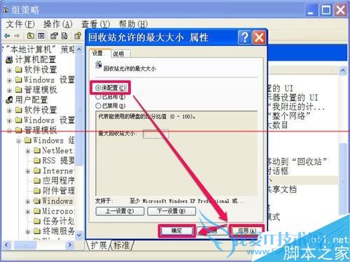 6、这里就是设置回收站大小的地方,如果想设置为其它值,如20%,可以把“最大回收站大小”值设置为“20”即可。如果要默认为系统设置值(系统默认为10%),就无须设置了,直接将“已启用”改为“未配置”,然后按“应用”保存,按“确定”退出窗口,设置完成。