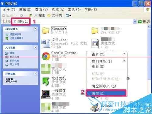 7、为了看看解决效果,再回到回收站,然后在空白处右键,选择右键菜单中的“属性”这一项,进入。