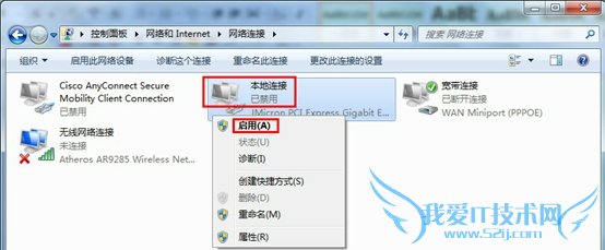 故障点三:本地连接是灰色的,显示已禁用。选择本地连接右击启用即可,如下图: