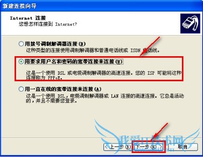 6. 左键点击”用要求用户名和密码的宽带连接来连接”--->左键点击“下一步”按钮,如下图: