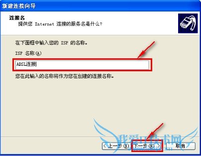 7. 随意输入一个ISP名称(这里演示输入ADSL连接) --->左键点击“下一步”按钮,如下图: